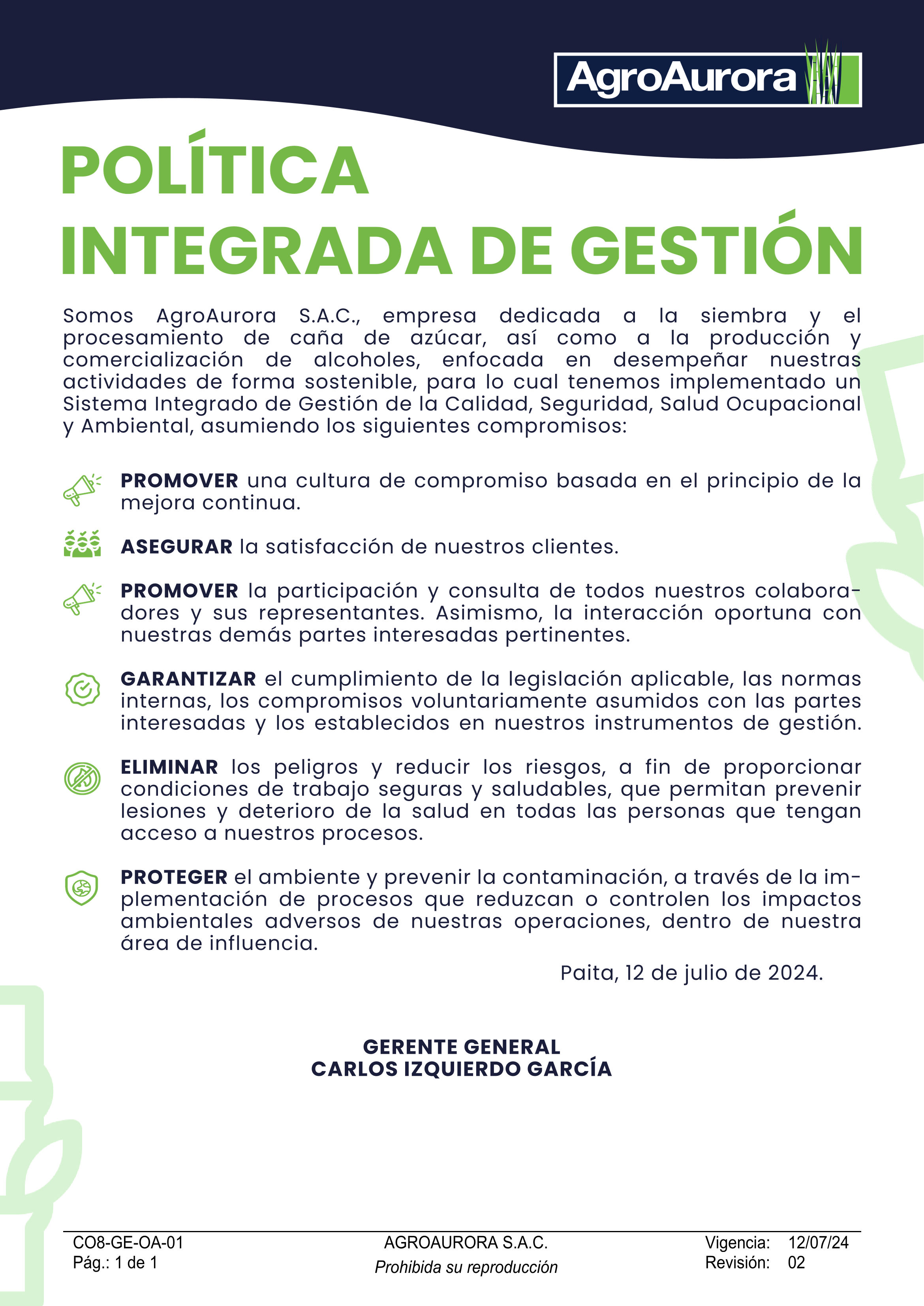 AGROAURORA S.A.C. (en adelante, “LA EMPRESA”), identificada con RUC N° 20600180631, con domicilio la carretera Sullana- Paita Km 18 margen izquierdo, provincia de Paita; reconoce la importancia que tiene la privacidad de los datos personales de nuestros usuarios, por ello, garantizamos la absoluta confidencialidad de los mismos y el empleo de estándares de seguridad conforme a lo establecido en la Ley de Protección de Datos Personales - Ley N° 29733 y su Reglamento aprobado por el Decreto Supremo 016-2024-JUS (en adelante, “las normas de protección de datos personales”).